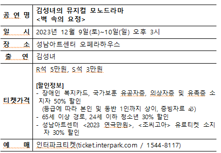◇ 뮤지컬 모노드라마 <벽 속의 요정>, 12월 9일~10일 성남아트센터 오페라하우스