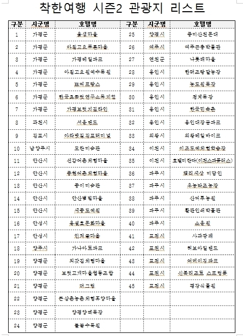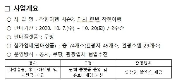 경기도와 경기관광공사(이하 공사)는 ‘착한여행 시즌2, 다시 한번 착한여행’에서 관광지뿐만 아니라 호텔까지 확대 지원해 코로나19 장기화로 어려운 관광업계를 돕고 내수 관광을 활성화 할 계획이다. 이번 캠페인은 지난 시즌 1때 인기가 높았던 서울랜드, 한국민속촌, 허브아일랜드, 쁘띠프랑스를 비롯 도내 주요관광지 45곳에 호텔 29곳을 추가해 총 74곳이 참여하며, 국내 최대 오픈마켓인 쿠팡을 통해 10월 7일 오전 10시부터 20일까지 2주간 판매한다.
