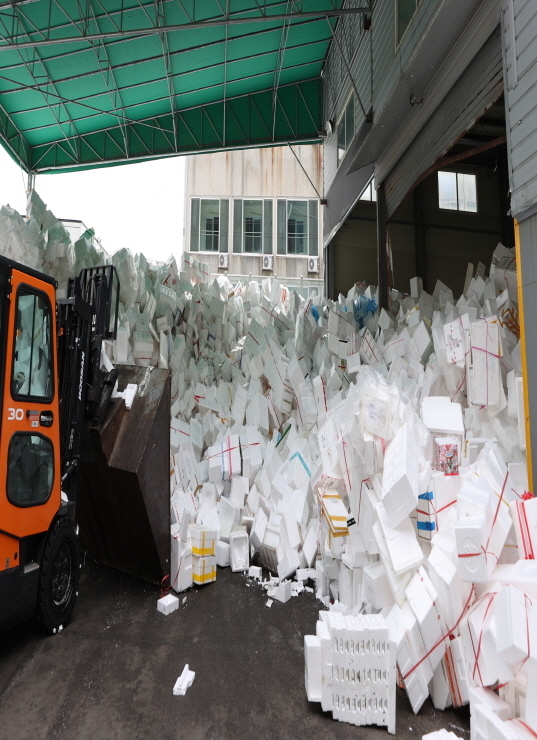 용인시 이동읍 재활용센터는 관내 전 지역에서 배출된 스티로폼 폐기물을 재활용 처리하는 곳으로 현재 일 평균 처리용량은 5톤 정도이지만 약 8톤 가량이 유입되고 있다.