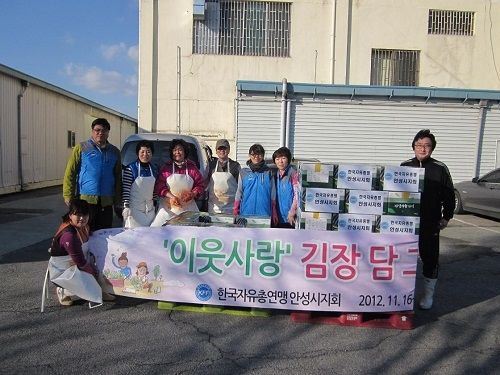 한국자유총연맹 안성시지회는 손수 농사지은 재료를 이용해, 이웃을 사랑 하는 마음으로 김치를 담가 10kg, 70박스를 만들어 안성시에 기증했다.