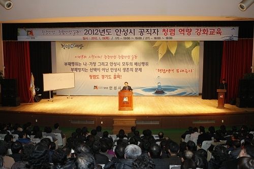 올해 안성시가 청렴도 우수기관으로 선정된 것은 2010년에서 2011년 2년 연속 최하위 청렴평가를 받으면서 2012년 1월부터 청렴도 특단의 대책을 수립, “청렴안성․청정안성”을 실현하기 위해 4개 분야(교육강화, 자체청렴강화, 예방신고강화, 감찰활동 강화)로 나눠 37개 시책을 연중 지속적으로 펼쳐왔기 때문이다.