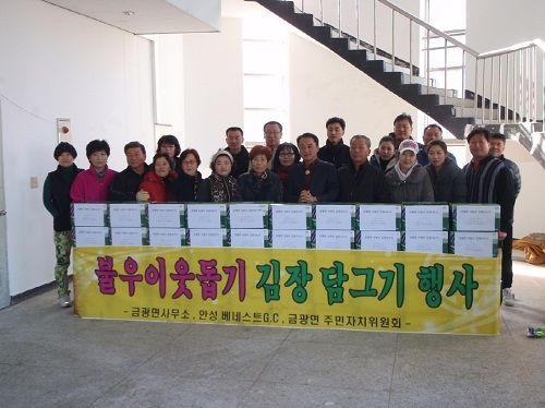 안성시 금광면 주민자치위원회, 금광면 사무소, 안성 베네스트 G.C 는 지난 11월 26일 본격적인 월동준비 시즌을 맞아 60여명이 참가한 가운데 『불우이웃돕기 김장 담그기 행사』를 가졌다.