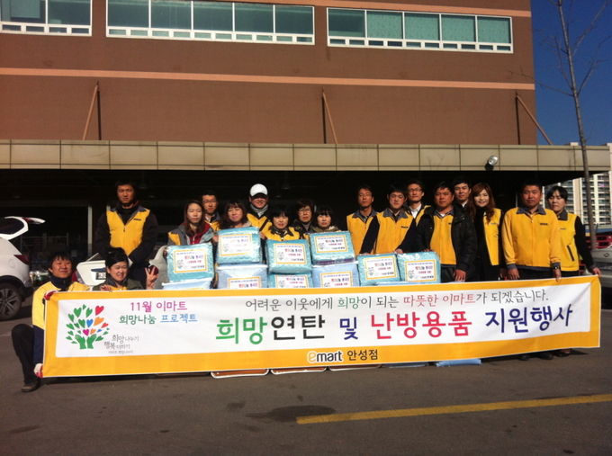 이마트 안성점 관계자는 “어렵게 겨울을 준비하고 있는 이웃들에게 조금이나마 도움이 되서 매우 기쁘다. 사회공헌활동을 지속적으로 연계하여 어려운 가구들에게 힘이 될 수 있도록 하겠다.“고 말했다.