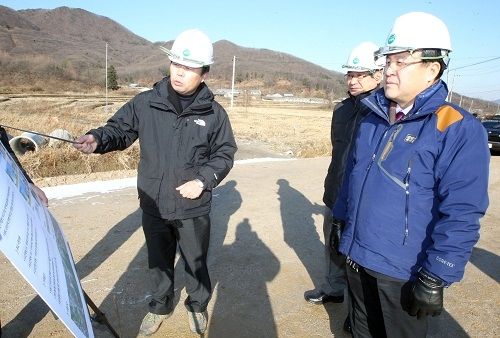김학규 용인시장은 지난 4일 간부공무원과 함께 경안천 마평 수질정화 습지와 백원 대3-5호(백암면 용천리) 도로개설 사업장을 방문, 추진 현황을 점검하고 공사관계자들을 격려했다.