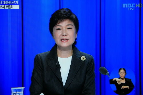 이 후보는 새누리당이 최저임금을 평균임금 수준으로 올리는 법안을 가로막은 일도 문제삼았다. 그는 “박 후보가 국회에서 비정규직 차별 철폐하겠다 말씀하셨는데 이 법안을 가로막는다면 양극화와 여성차별 문제에 대한 해결의지가 없는 것”이라며 “말로만 민생위하는 것 아닌가”라고 비판했다.
