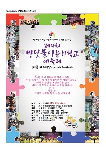 장애인과 비장애인이 함께하는 다양한 문화 환경 조성에 기여해온 ‘반딧불이문화학교’가 제9회 정기예술제 ‘퍼즐 페스티벌’을 오는 11일부터 14일까지 행정타운 문화예술원 전시실과 공연장 마루홀에서 개최한다.