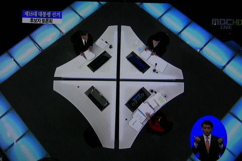 새누리당 박근혜, 민주통합당 문재인 대선 후보가 대선 D-3일인 16일 저녁 8시 마지막으로 마지막 3차 TV토론은 통합진보당 이정희 후보의 후보직 사퇴로 박근혜 새누리당, 문재인 민주통합당 두 후보만 참석한 가운데 100분간 처음으로 1997년 대선부터 실시된 TV토론 역사상 유력 후보간 양자 토론으로 진행됐다.