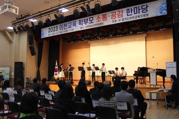 행사는 이천송정중 송정앙상블팀의 합주공연과 팝페라 공연을 시작으로, ▲이천교육지원청의 2023 이천교육 기본계획 발표 ▲이천시청의 교육지원사업 소개 ▲최해옥 강사의 알파세대 Z세대 자녀와 함께 행복한 부모되기 강연으로 이루어졌다.