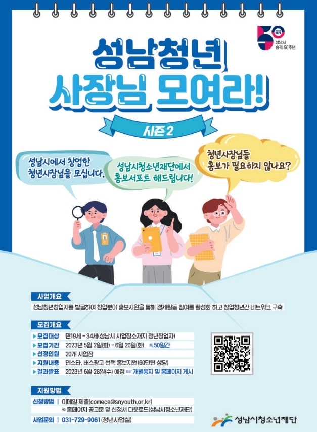 성남시청소년재단(대표이사 최원기)은 만19세~34세 청년 창업자의 창업 홍보 지원을 위한 성남시 사업장소재지의 청년 창업자를 모집한다. 최종 20명을 선발할 예정으로 5월 2일(화)부터 6월 20일(목)까지 50일간 지원할 수 있다.