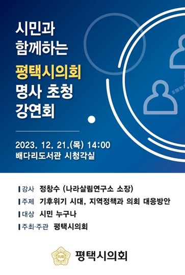 (중부시사신문) 평택시의회는 오는 21일 오후 2시 평택시 배다리도서관 시청각실에서 기후위기 관련 명사 초청 강연회를 개최할 예정이다.
