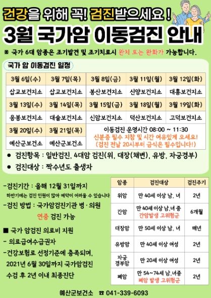 (중부시사신문) 예산군보건소는 인구보건복지협회 대전충남지회와 함께 국내 사망원인 1위인 암 조기발견 및 의료비 절감과 군민 건강 향상을 위해 ‘찾아가는 국가 암 이동검진’을 3월 6일부터 21일까지 실시한다.