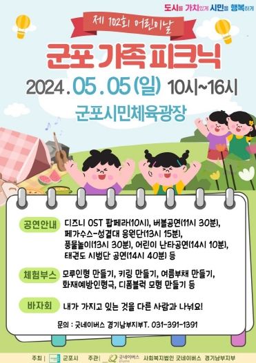 (중부시사신문) 군포시는 오는 5월 5일 어린이날에 2024 어린이날 행사 ‘군포 가족 피크닉’ 을 군포시민체육광장에서 개최한다.