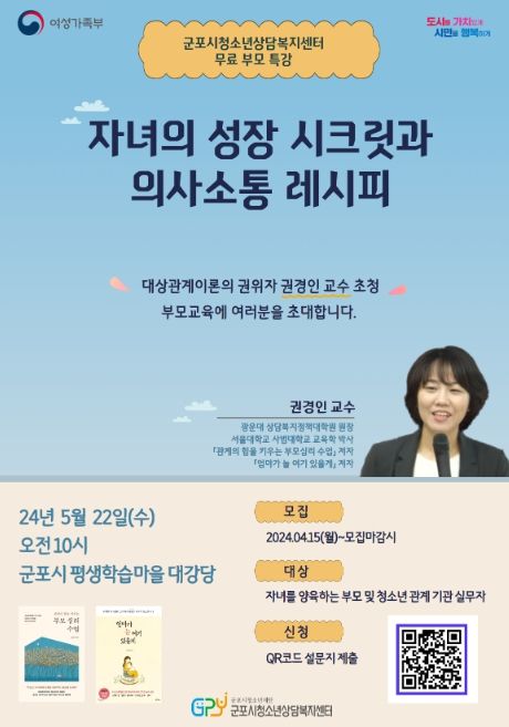 군포시청소년상담복지센터 강연미 센터장은 “부모 자녀 의사소통 전문가이신 권경인 교수님을 초빙하여, 부모님들을 모시고 자녀를 이해하고 올바른 양육 방법에 대해 배울 수 있는 시간이 되기를 기대한다”라고 밝혔다.