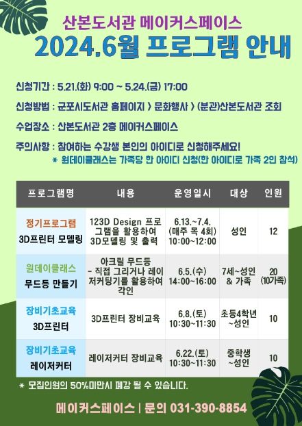 (중부시사신문) 군포시 산본도서관은 오는 21일부터 메이커스페이스 6월 프로그램 수강생을 모집한다.