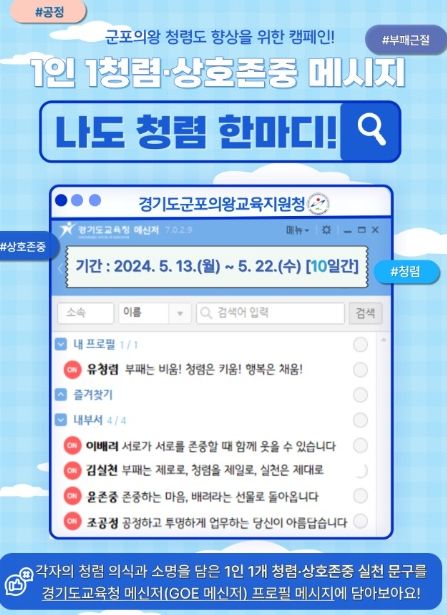 캠페인 참여방법은 각자의 청렴 의식과 소명을 담은 1인 1개의 청렴·상호존중 실천 메시지를 매일 업무하면서 이용하는 경기도교육청 메신저(GOE메신저) 프로필 메시지에 담아 캠페인 기간 동안 게시하는 것으로, 군포의왕 관내학교와 교육지원청 교직원들은 모두가 참여할 수 있는 ‘나도 청렴 한마디 캠페인’을 통해 청렴·상호존중을 일상화하고, 1인 1청렴·상호존중 실천문구를 조직구성원들과 비교·공유하며 스스로 청렴·상호존중 실천을 다짐하는 청렴공감대를 형성했다.