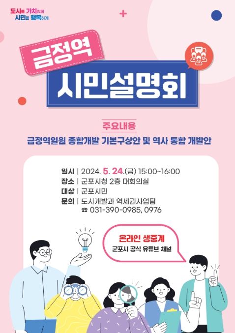 (중부시사신문) 군포시는 24일 ‘금정역 일원 종합개발 기본구상안 및 역사 통합 개발안’ 사업추진 과정에서부터 시민 참여와 정보를 공유하고 시민의견 개진을 위해 시민설명회를 열어 금정역 일원 기본구상안 및 통합 개발안에 대하여 설명한다.
