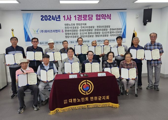 (중부시사신문) (사)대한노인회 연천군지회는 최근 연천군 종합복지관 3층 소강당에서 ㈜와이즈이앤지(대표 우현명)와 관내 14개 경로당과 1사 1경로당 협약식을 가졌다고 24일 밝혔다.
