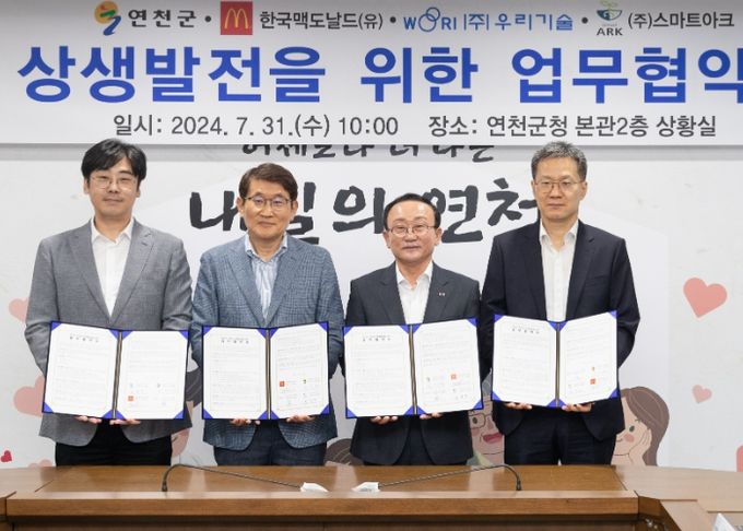 (중부시사신문) 연천군은 지난달 31일 군청 본관 2층 상황실에서 한국맥도날드(유), ㈜우리기술, ㈜스마트아크와 농산물 유통 활성화 등 상생 발전을 위한 업무협약을 체결했다고 밝혔다.