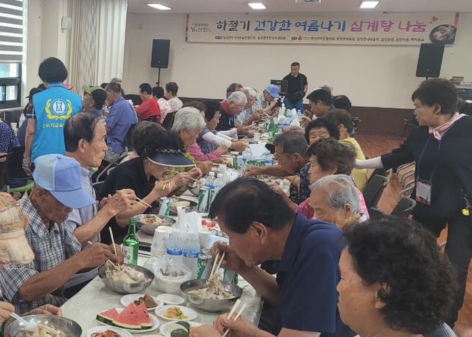 (중부시사신문) 연천군 왕징면 지역사회보장협의체와 주민자치위원회는 8일 왕징면주민복지문화센터에서 협의체위원 및 주민자치위원 30여명이 참여한 가운데, 관내 취약계층 및 어르신 250명에게 직접 조리한 삼계탕을 제공하는 건강한 여름나기 나눔행사를 실시했다.
