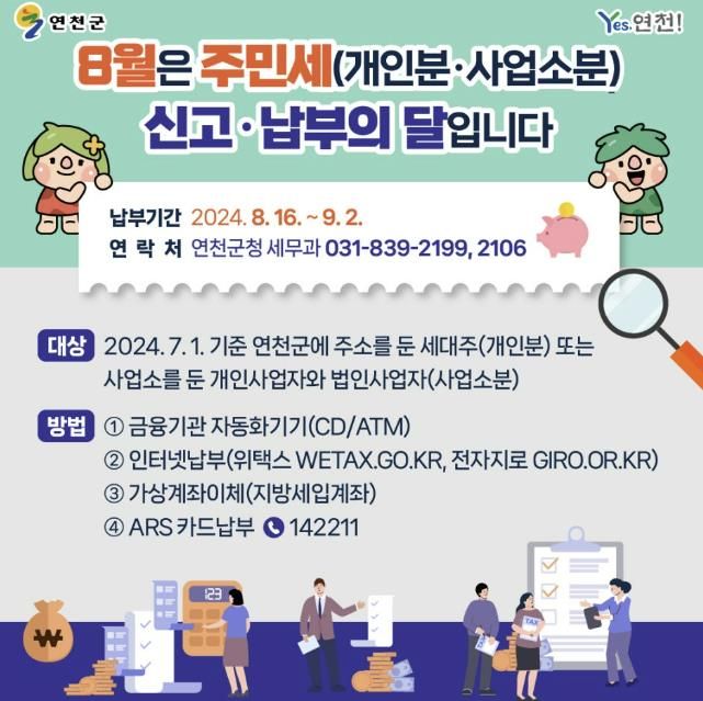 개인분 주민세는 7월 1일 현재 연천군에 주소를 둔 세대주에게 부과되며, 사업소분의 경우 7월 1일 현재 연천군에 사업소를 둔 개인 및 법인사업자에게 부과된다. 다만, 개인사업자는 전년도 부가가치세 과세표준액이 8천만원 이상인 사업자만 해당된다. 납부기간은 8월 16일부터 9월 2일까지다.
