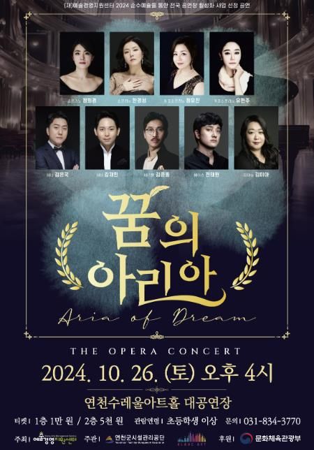 (중부시사신문) 연천수레울아트홀에서 오는 10월 26일 토요일 오후 4시에 오페라 콘서트 '꿈의 아리아' 공연을 개최한다고 밝혔다. 이번 공연은 오페라 콘서트 형식으로 친숙한 오페라 아리아를 한 편의 드라마처럼 재구성하여 누구나 부담 없이 즐길 수 있도록 준비하였다.