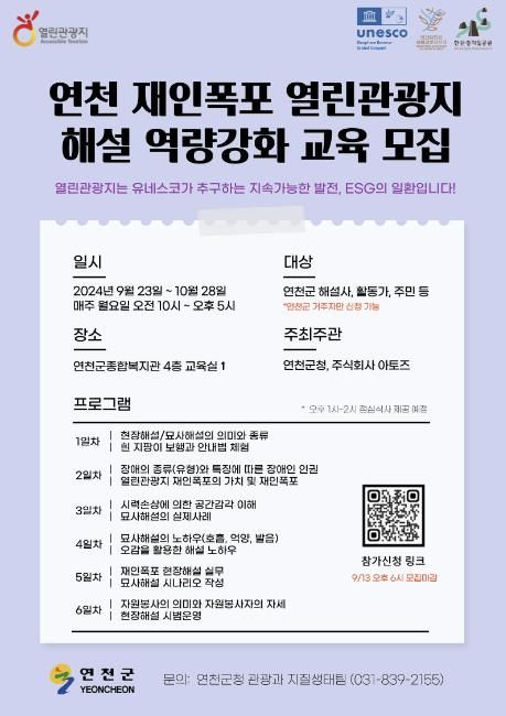 교육 신청은 포스터 내 QR코드 또는 네이버폼 링크를 통해 가능하며, 9월 13일 금요일 오후 6시에 마감된다. 자세한 사항은 연천군청 관광과 지질생태팀으로 문의하면 된다.