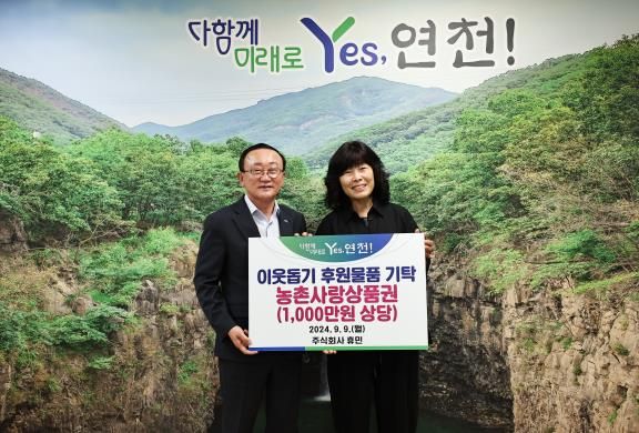 (중부시사신문) 연천군은 지난 9일 주식회사 휴민이 연천군청을 방문해 민족 대명절인 추석을 맞아 지역사회의 저소득층을 지원하기 위해 1,000만원 상당의 농촌사랑상품권을 기탁했다고 밝혔다.