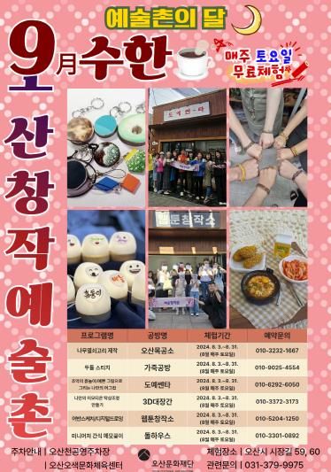 (중부시사신문) 2024년 (재)오산문화재단에서는 오산창작예술촌의 홍보와 입주작가의 문화예술 역량강화를 위해 올해 새롭게 기획한 ‘예술촌의 달’행사를 지난 8월에 이어 9월까지 다양한 문화예술체험 프로그램을 준비하여 성황리에 진행하였다. ‘예술촌의 달’은 1년 중 특정 월을 선정하여 매주 토요일 무료체험 행사를 운영하는 행사이다. 예술촌 체험 프로그램은 6개 공방(오산목공소, 가죽공방, 도예센터, 3D대장간, 웹툰창작소, 돌하우스)별로 운영되며, 예술촌의 달 매주 토요일마다 각 공방별로 10명의 참여자를 선정하여 운영한다. 예술촌의 달 9월 행사 컨셉은 ‘구수한 오산창작예술촌’으로 특히 가족단위 참여자를 위한 홍보를 진행하였다.