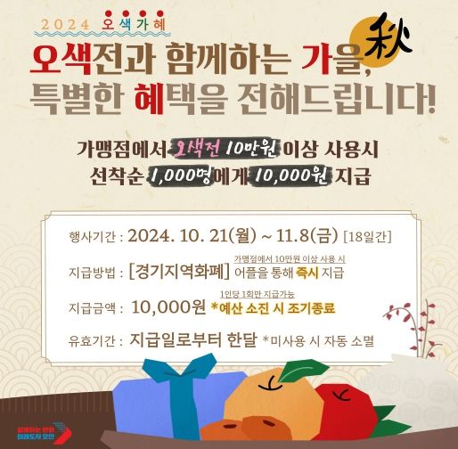 (중부시사신문) 오산시는 2024년 가을을 맞아 이달 21일부터 다음 달 8일까지 오색전 사용자를 대상으로 오색전 가맹점에서 누적금액 10만 원 이상 사용 시 선착순 1,000명에게 1만 원의 혜택을 제공하는 이벤트를 실시한다.