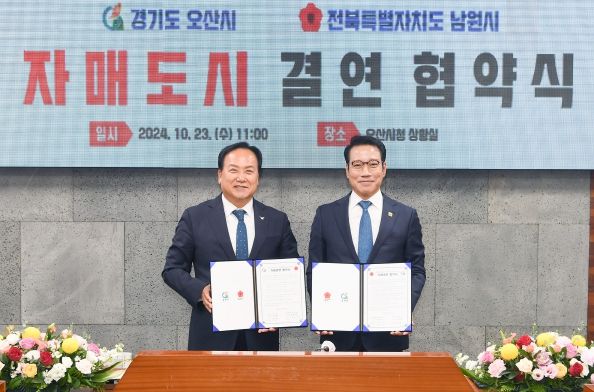 (중부시사신문) 경기도 오산시와 전북특별자치도 남원시가 23일 오전 오산시청 상황실에서 자매결연 협약식을 맺고 상생발전 및 공동발전 협력 강화에 나서기로 했다.