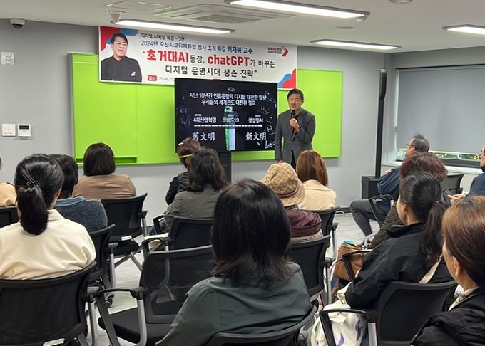 (중부시사신문) 오산시는 1일 오산AI코딩에듀랩에서 ‘초거대 AI 등장, chatGPT가 바꾸는 디지털 문명시대 생존 전략’을 주제로 명사 초청 디지털 AI시민 특강을 진행했다.