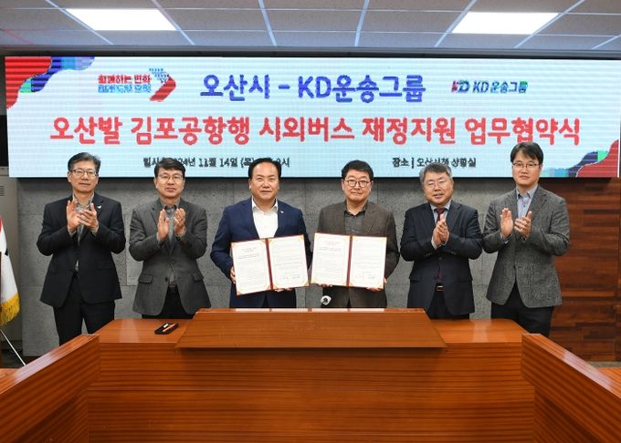 오산시는 14일 오후 시청 2층 상황실에서 KD운송그룹과 ‘오산↔김포공항 시외버스 재정협약(MOU)’을 체결하고 이같이 밝혔다.