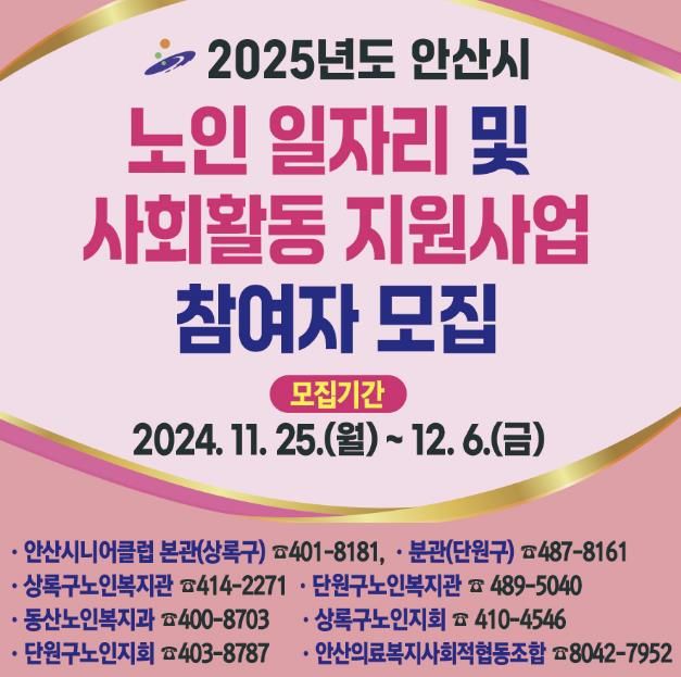 (중부시사신문) 안산시는 오는 25일부터 다음 달 6일까지 ‘2025년 노인일자리 및 사회활동 지원사업’ 참여자 6천387명을 모집한다고 22일 밝혔다.