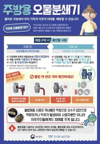 주방용 오물분쇄기는 한국물기술인증원에서 인증을 받은 제품만 가정집에서 사용이 가능하다. ▲인증표시가 없는 제품 ▲일체형이 아닌 제품 ▲분쇄된 음식물 찌꺼기를 20% 넘게 하수관으로 배출하는 제품 등은 모두 불법으로 판매나 사용을 금지하고 있다.