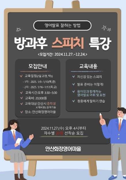 (중부시사신문) 안산시는 안산화정영어마을에서 관내 중학생(예비 중1 포함)을 대상으로 새해맞이 ‘방과후 스피치 특강’ 수강생을 모집한다고 29일 밝혔다.