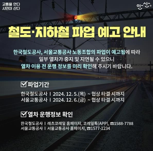 이민근 안산시장은 “이번 철도노조 총파업으로 시민들이 불편을 겪을 수 있어 우려된다”라며 “이번 파업 기간 동안 전세버스 투입 등 비상수송 대책을 철저히 추진해 시민 불편을 최소화할 수 있도록 노력하겠다”고 말했다.