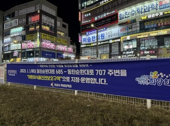 시는 어린이 식품안전보호구역 신규 지정에 따라 동탄순환대로 685부터 동탄순환대로 707 일대 도로중앙 화단분리대에 어린이 식품안전보호구역 안내 표지판을 설치했다.