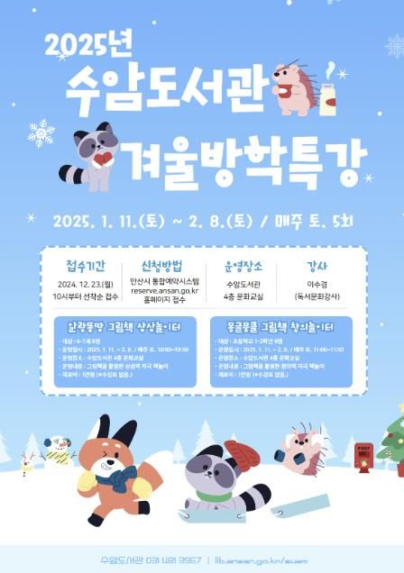 (중부시사신문) 안산시 수암도서관에서는 학생들의 2025년 겨울방학 기간을 맞이해 겨울방학특강 2개 강좌를 운영한다고 26일 밝혔다.