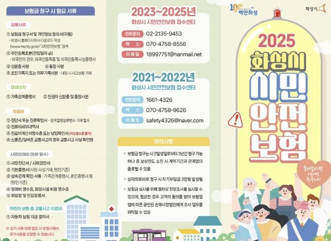 보장 대상은 화성시에 주민등록을 둔 시민으로 등록 외국인, 거소 등록 동포를 포함한 화성시민 누구나로, 별도의 가입 절차 없이 지원되며 보장 기간은 2025년 1월 1일부터 12월 31일까지다.