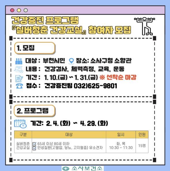 소사보건소는 프로그램 운영을 통해 지역사회 건강 관리체계를 구축하고, 건강생활실천 분위기를 확산할 방침이다.