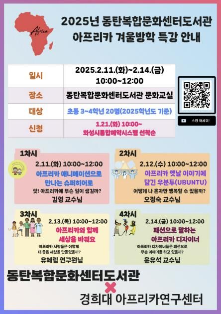 (중부시사신문) (재)화성시문화관광재단 동탄복합문화센터도서관이 경희대학교 아프리카연구센터와 함께 초등학교 3~4학년을 대상으로 2025년 2월 11일부터 2월 14일까지 총 4차시에 걸쳐 아프리카 문화 체험 겨울방학 특강을 개최한다.