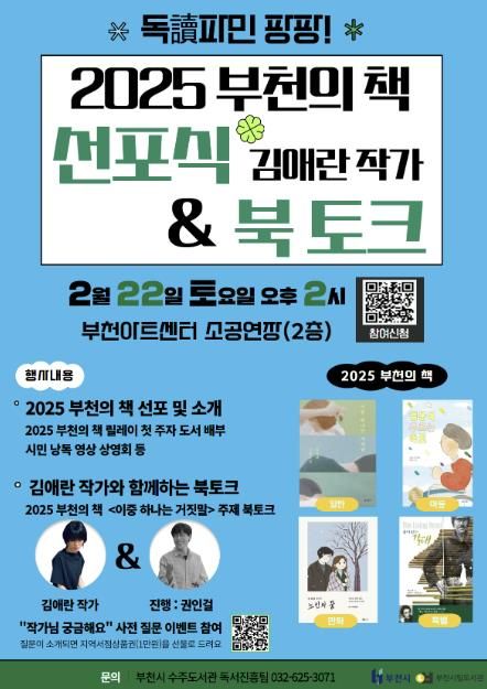(중부시사신문) 부천시는 오는 2월 22일 토요일 오후 2시 부천아트센터 소공연장에서 ‘2025 부천의 책 선포식 · 북토크’ 행사를 개최한다.