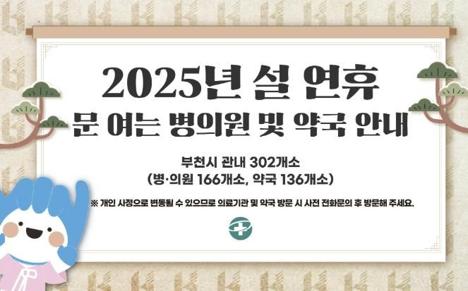 설 연휴 기간 동안 운영하는 의료 기관 및 약국 현황은 포털사이트 검색창에서 ‘명절 병원’, ‘명절 진료’를 검색하거나, 스마트폰 앱 ‘E-gen’을 통해 확인할 수 있다. 또한 응급의료포털, 부천시 누리집, 부천시보건소 누리집에도 확인이 가능하다.