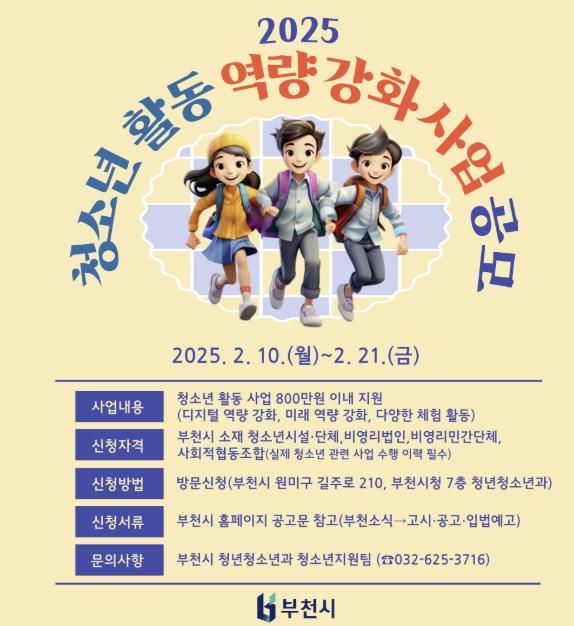 자세한 내용과 신청 서류는 부천시 홈페이지(부천소식 ' 고시·공고·입법예고)에서 ‘2025년 청소년 활동 역량 강화 공모 사업’을 검색하여 확인하거나 청년청소년과로 문의하면 된다.