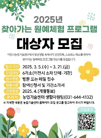 (중부시사신문) 이천시는 오는 3월 21일까지 2025년 찾아가는 도시농업 체험 프로그램 대상자를 모집한다.
