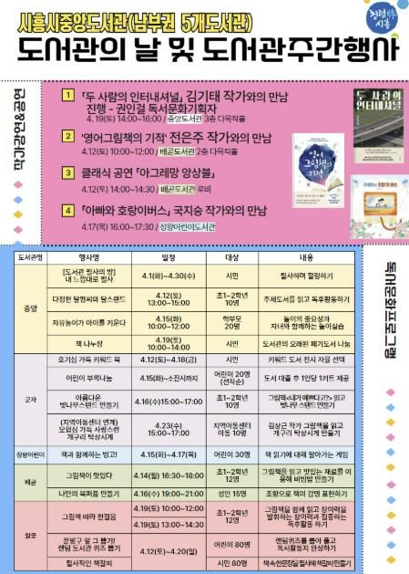 (중부시사신문) 시흥시중앙도서관은 오는 4월 12일부터 18일까지 ‘도서관의 날’ 및 ‘도서관 주간’을 맞아 시민들을 위한 다채로운 독서문화행사를 진행한다.