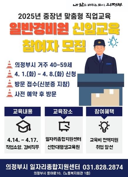(중부시사신문) 의정부시는 중장년 구직자를 위한 맞춤형 직무교육으로‘일반경비원 신임교육’ 참여 대상자를 모집한다.