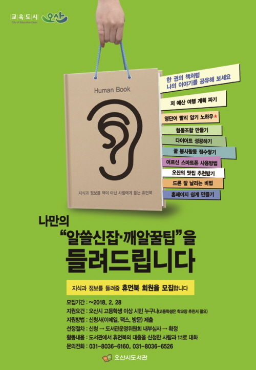 이러한 살아있는 정보를 제공할 휴먼북을 현재 모집 중이며, 휴먼북은 고등학생 이상의 오산 시민이라면 누구나 신청할 수 있고, 다양한 주제의 이야기를 전할 수 있다. 예를 들어 ‘나만의 다이어트 비법’, ‘어르신 스마트폰 사용방법’과 같은 실생활과 밀접한 주제에서 ‘홈페이지 쉽게 만들기’와 같은 전문적인 주제까지 자신이 다른 사람보다 잘 알고 있다고 생각하는 주제를 선택하면 된다.