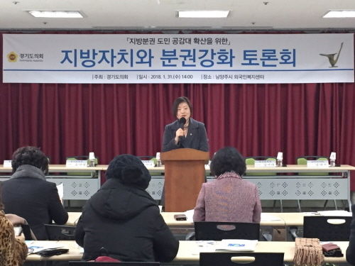 토론의 좌장을 맡은 문경희 의원(더민주, 남양주2)은 “우리나라 지방자치의 현실을 보면, 중앙정부에 사무와 재원이 모두 집중되어 있어 지역마다 특수성이 있음에도 지역실정에 맞는 행정을 못하고 있으며, 국가사무와 자치사무의 비율이 8:2로 국가가 거의 모든 일을 다 처리하고 있고, 세입의 80%가 국세이다 보니 지방은 자체수입이 거의 없어서 중앙정부에 전적으로 의존하고 있는 실정”이며, “진정한 의미의 지방자치를 실현하기 위해서는 지자체에 실질적인 권한 부여가 이루어져야 하는데,