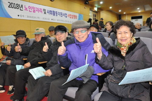 2018년 노인일자리 활동은 공익활동형(공공시설파견활동, 문화시설파견활동, 장애인불법주차계도활동, 경륜전수활동 등) 390명, 시장형(시민운동장파견사업, 웰빙카페사업, 두부제조판매사업, 백옥미마을 등) 251명, 인력파견형(인력파견형사업) 200명, 총 21개 활동에서 841명을 모집하여 어르신들의 활기차고 건강한 노후생활을 지원할 예정이다.